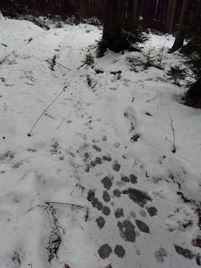 Z autobusu jsem vystoupil na své osvědčené zastávce a opravdu netrvalo dlouho a narazil jsem na vlčí stopní dráhy. Potěšení se chvílemi mísilo s obavami, zda narazím na důkaz, že jsou vlci víc než dva. Vlci totiž na sněhu rádi našlapují do stop jedince, který jde první, podobně jako lidé v závěji. Občas není lehké určit, kolik vlků sledujete, dokud se nerozdělí před stromem nebo balvanem, který třeba obejdou každý z jiné strany. Jenže to se nestalo během několika kilometrů, po které jsem stopy sledoval. Kapičky krve, které jsem ve stopě každou chvíli nacházel, ukazovaly na hárající vlčici. Nabízí se tedy vysvětlení, že rodičovský pár si v období páření „odskočil“ stranou. V podvečer jsem narazil v jistém údolí na další dvojici stop a pak ještě jednu dráhu zvířete, které šlo samo. Možná to bylo vlče, nebo dokonce vlčata. Při své další návštěvě jsem pak poblíž narazil na hotovou vlčí „dálnici“. S kamarádem, který pak místo navštívil se mnou, jsme už jen stěží dokázali uvěřit, že by vlků bylo méně než dva, ale stoprocentní důkaz chyběl. Na trochu výhodnější místa jsme přeinstalovali dvě fotopasti.