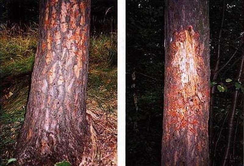 Medvědí "zrcadlo" je v přítmí lesa z dálky zřetelně viditelné. Orlová, 1.9.2002. Stejný strom z odvrácené strany, v kůře jsou rýhy po medvědích drápech. Snímky H. Kuzník.