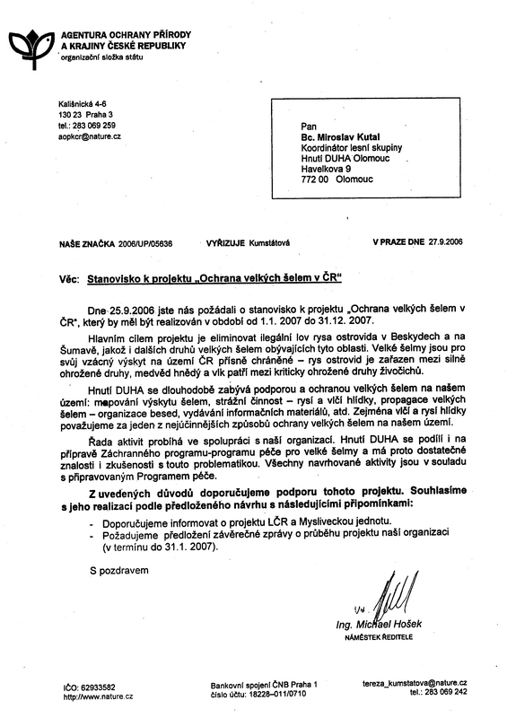 Agentura ochrany přírody a krajiny v dopise Hnutí DUHA Olomouc