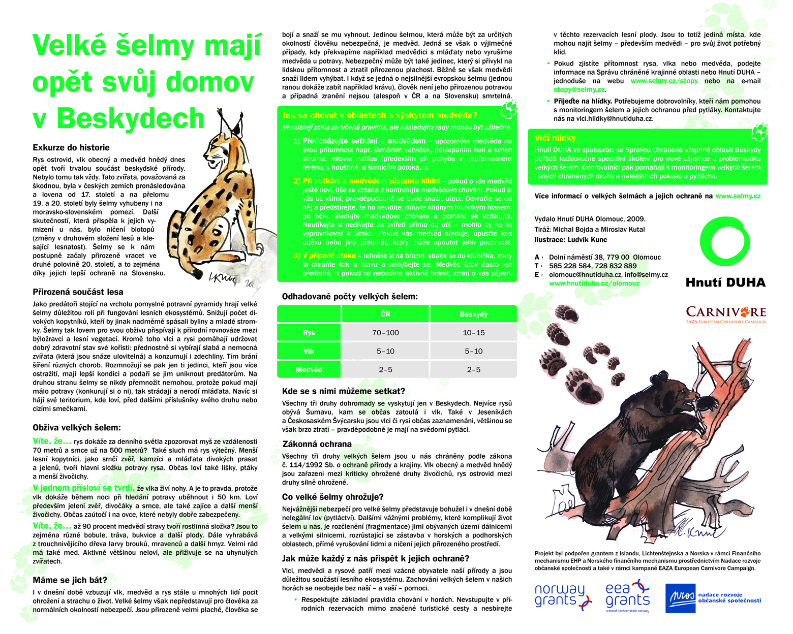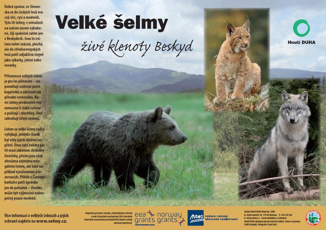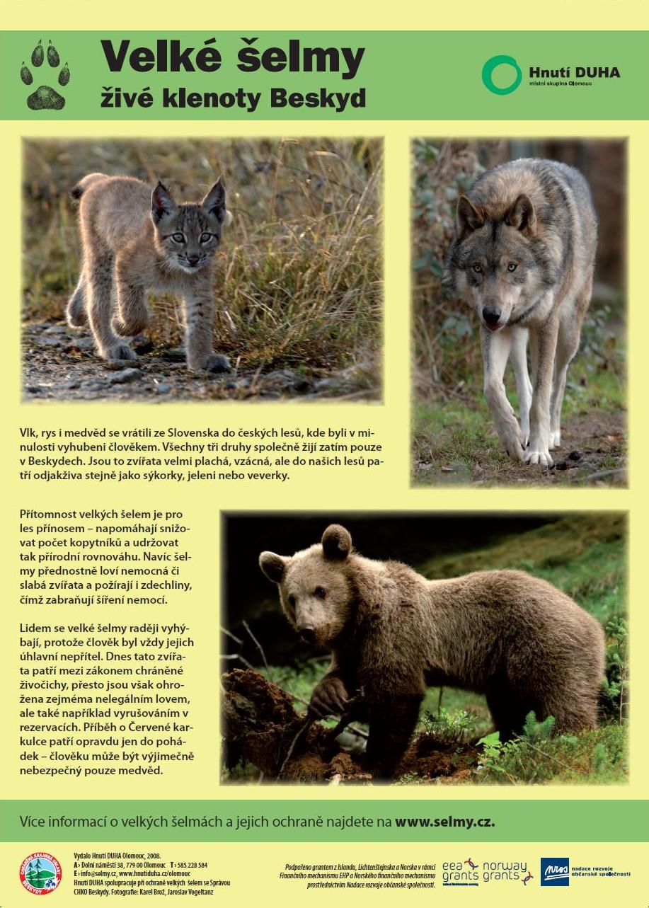 V rámci osvětové a vzdělávací kampaně na ochranu velkých šelem v Beskydech jsme vyrobili a rozmístili po školách celkem 30 naučných panelů. V současnosti už další volné panely k dispozici nemáme, ale vážným zájemcům můžeme po dohodě nechat vyrobit.